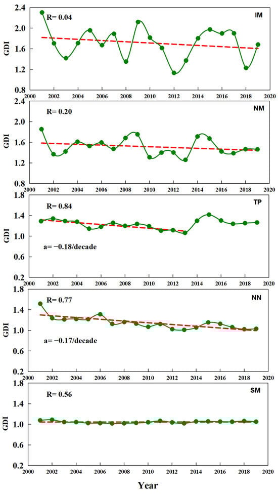 Figure 3 shows the inter-annual variations of grassland degradation index () in five regions. The IM experiences the most drastic fluctuations, generally changing between mild and moderate degradation. The ecological functional performance of this area appears relatively fragile, as evidenced by a sharp increase to the peak value ( = 2.12) in just one year (2008–2009) followed by a decrease to the lowest value ( = 1.13) over the subsequent three years. The change of in NM maintained a pattern similar to that in IM during the study period. However, it revealed relatively gentle fluctuations of values, verifying that Ningxia remained consistently at a mild degradation level over the 20-year period. It remains between mild-degraded states and moderate-degraded states. in the TP maintained a steady declining trend from 2001 to 2013 at the rate of 0.13 per decade, then entered into a relatively irregular upward phase after reaching its lowest value ( = 1.06) in 2013. It reached its highest value of 1.42 in 2014–2015. Compared with other regions, the inter-annual variation of NN was relatively flat and showed a continuous downward trend (a = −0.13). The variation of NN has a high matching degree with the trend line (R = 0.75), showing an obvious degree of fit from 2001 to 2019. Although showed a slight increase in 2005–2006 and 2014–2015, the survey data in 2019 ( = 1.03) was obviously lower than that at the beginning of the study ( = 1.52). This suggests that the grassland in this area has been in a relatively stable state of continuous recovery in the past 19 years. There were slight variations (between 1.01 and 1.06) in mildly degraded states throughout 20 years in SM, indicating stable grassland ecological functional performance.