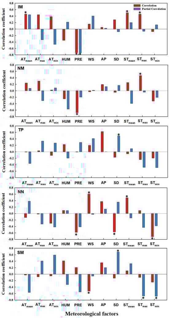 In the NM, had a significant negative simple correlation with (r = −0.68). Meanwhile, the showed a positive significant correlation with , with a correlation coefficient of 0.47. However, the partial correlations between and all of the meteorological factors were not statistically significant (p > 0.5). This lack of significance can be attributed to the promotion effect of on vegetation cover and the promotion effect of on canceling each other out, resulting in no significant partial correlation between meteorological factors and in this region.