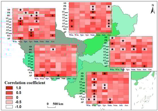 All months are denoted using the first three letters as abbreviations. The “*” mark indicates that the correlation between this meteorological factor and the in that region is highly significant.