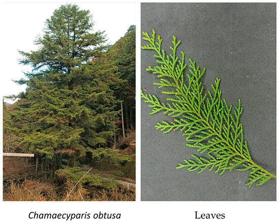 The gymnospermous species, Chamaecyparis obtusa (Siebold et Zucc.) Endl., belonging to the Cupressaceae family, grows 20–30 m in height and is up to 1 m in diameter. It has red-brown bark. The alternate leaves are scale-like, 2–4 mm in length, and obtusa (Figure 1). This species is native to Taiwan and Japan and is widely cultivated in the temperature regions in East Asia for its high-quality and profitable timber [1,2,3,4,5]. However, the timber-processing industry produces a large amount of waste, such as tree bark, branches, and leaves, and minimizing waste would reduce environmental impacts and economic concerns [6,7]. It is, therefore, valuable to develop possible uses for the waste from timber processing to reduce the negative impacts of timber waste from C. obtusa.