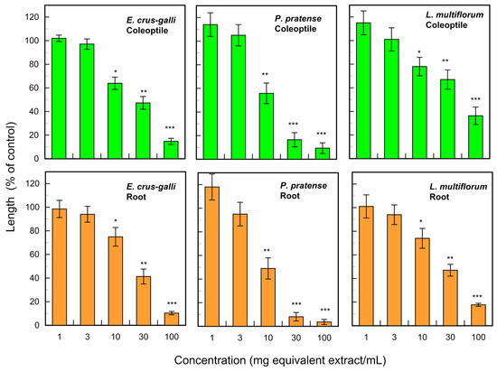 Effects of the methanolic extract of C. obtusa leaves on the root and coleoptile growth of E. crus-galli, P. pratense, and L. multiflorum under laboratory conditions. The concentrations indicate the extracts obtained from 1, 3, 10, 30, or 100 mg fresh weight of C. obtusa leaves per mL. Means ± SE were calculated from 4 independent experiments with 10 seedlings for each determination. Asterisks show significant differences between treatment and control: *; p < 0.05, **; p < 0.01, ***; p < 0.001.