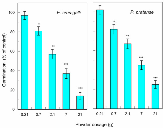 Effects of the leaf powder of C. obtusa on the germination of E. crus-galli and P. pratense under greenhouse conditions. Leaf power (0.21, 0.7, 2.1, 7, and 21 g powder per pot) was spread over soil surface of the pots. Means ± SE were calculated from 4 independent experiments with 100 seeds for each determination. Asterisks show significant differences between treatment and control: *; p < 0.05, **; p < 0.01, ***; p < 0.001.