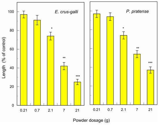 The leaf powder also inhibited the growth of the above-ground parts of E. crus-galli and P. pratense under greenhouse conditions at dosages ≥ 2.1 g of powder per pot (Figure 5). The inhibition was increased with the increasing powder dosage. The IC50 value of the powder dosage against the growth of E. crus-galli and P. pratense was 4.6 g and 6.7 g of powder per pot, respectively.