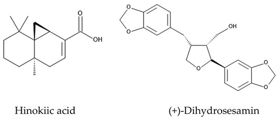 Chemical structures of hinokiic acid and (+)-dihydrosesamin.