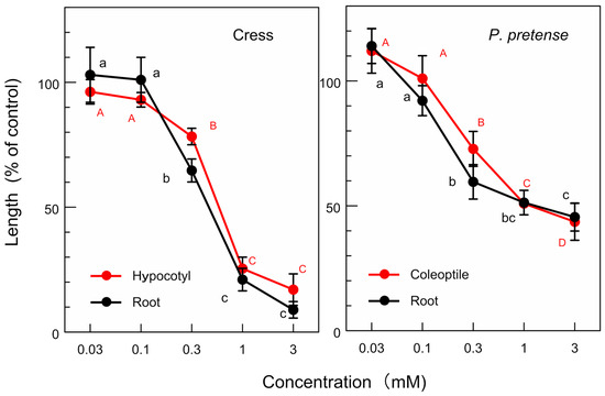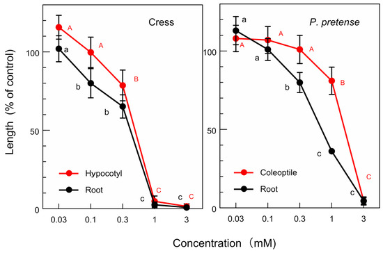 In our study, extracts of C. obtusa leaves were separated through the bioassay-guided separation process using the stepwise solvent system and bioassay using cress seeds. The germination of weed species, E. crus-galli, P. pratense, and L. multiflorum, was unstable, and the germination rate was 20–40% at 48 h after sowing. On the other hand, the germination of cress was high (>90%) and stable, as described by Kato-Noguchi et al. [52]. In addition, the extract of C. obtusa leaves also inhibited the cress roots and hypocotyls in a concentration-dependent manner (Figure 3). The sensitivity of the cress roots and hypocotyl to the C. obtusa leaf extract was relatively high in comparison with the IC50 values of these weed species exposed to the extracts (Figure 2 and Figure 3). The biological activity of all separated fractions after every separation step needed to be determined for the bioassay-guided separation process, and the most active fraction in each separation step was subjected to the next separation step. Therefore, cress was selected as a bioassay plant species because of its stable germination rate and easy handling.