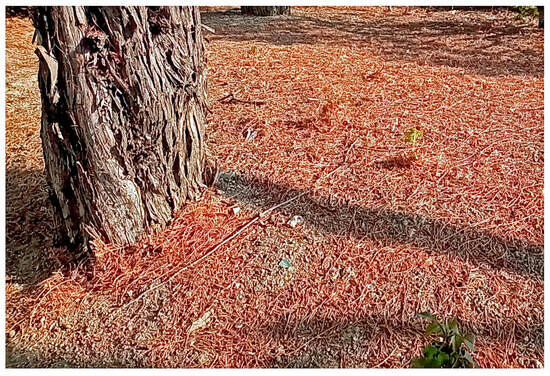 C. obtusa is an evergreen species with scale-like leaves (Figure 1). However, its old leaves are dropped and replaced by young leaves in several years, and the fallen leaves accumulate in the soil under the tree as litter (Figure 9). The fallen leaves of the species reportedly amount to 2.9 t–6.4 t ha−1 per year [57,58,59]. The litter of scale-like leaves is easily broken into small pieces [60], is decomposed by 16% and 45% after 3 and 15 months, respectively, and forms a topsoil layer on the forest floor [57,61]. Hinokiic acid and (+)-dihydrosesamin in the leaves may be released into the soil of the forest floor during the decomposition process of the fallen leaves of C. obtusa. It has been reported that several allelochemicals, including the well-known allelopathic substance juglone, are contained in the leaves of the respective species and liberated into the soil during the decomposition process of the leaves [10]. Two potent allelochemicals, 7-oxodehydroabietic acid and 15-hydroxy-7-oxodehydroabietate, were found in the soil under Japanese red pine trees (Pinus densiflora Sieb. et Zucc.). The pine is also an evergreen species and is part of the Gymnosperm. These compounds originate from the fallen leaves of the pine and are generated during the decomposition process of the leaves [23]. Therefore, hinokiic and (+)-dihydrosesamin in the leaves may work as allelopathic agents of C. obtusa and contribute to its dominance in the natural ecosystem [8].