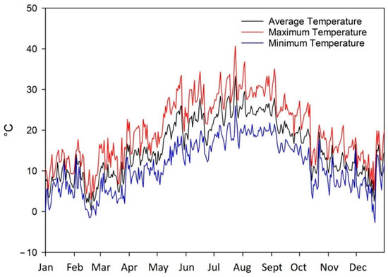 Throughout the year, recorded temperatures exhibited a clear seasonal pattern, in line with other years (Figure 1). The annual average temperature reflects this seasonal trend, with peak values around 30 °C in the summer months and lows of about 5 °C in the winter months.