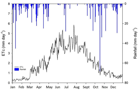 Daily trend of the crop evapotranspiration calculated following the Hargreaves-Samani equation (1985), FAO-56 crop coefficients, and rainfall during the year of the trial.
