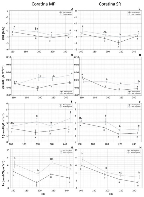 Mean and standard error of leaf water potential (LWP; MPa; (A), micropropagated; (B), self-rooted), stomatal conductance (gs; mmol H2O m−2 s−1, (C), micropropagated; (D), self-rooted), transpiration rate (E; mmol HO m−2 s−1; (E), micropropagated; (F), self-rooted), and net photosynthetic rate (Pn; µmol CO2 m−2 s−1; (G), micropropagated; (H), self-rooted) of micropropagated (MP) and self-rooted (SR) ‘Coratina’. Lowercase letters indicate significant differences before and after the irrigation; capital letters indicate differences among cultivars (p < 0.05).