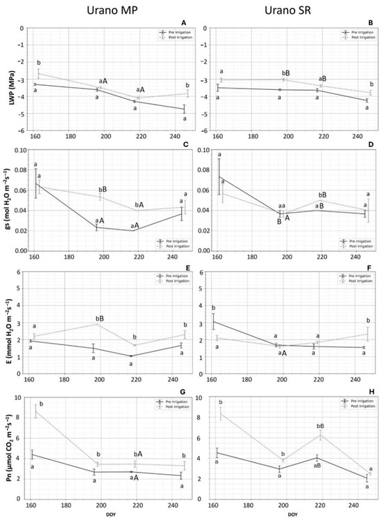 Mean and standard error of leaf water potential (LWP; MPa; (A), micropropagated; (B), self-rooted), stomatal conductance (gs; mmol H2O m−2 s−1, (C), micropropagated; (D), self-rooted), transpiration rate (E; mmol HO m−2 s−1; (E), micropropagated; (F), self-rooted), and net photosynthetic rate (Pn; µmol CO2 m−2 s−1; (G), micropropagated; (H), self-rooted) of micropropagated (MP) and self-rooted (SR) ‘Urano’. Lowercase letters indicate significant differences before and after irrigation; capital letters indicate differences among cultivars (p < 0.05).