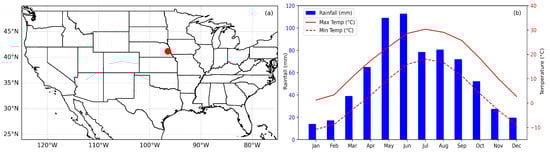 (a) Location of the study site, and (b) monthly climatology of rainfall (mm), minimum and maximum temperature (°C) climatology at the site based on 30-year (1991–2020) data from Mead station (Station ID: MEAD 4S; 41°10′12″ N, 96°28′12″ W).