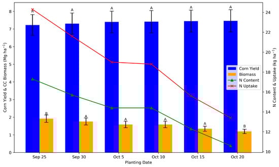 Corn yield (Mg[Dry] ha−1), CC biomass (Mg[Dry] ha−1), CC N uptake (kg[N] ha−1), and CC biomass N content (kg ha−1) for six different planting dates. The bars represent mean values with standard error bars indicating variability within each planting date. Letters above the bars denote significant differences between dates as determined by Tukey’s HSD test, where different letters indicate statistically significant differences (p < 0.05).