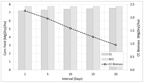 The corn yields for the five intervals were further compared with respective simulations without cover crop (NCC). The NCC yield was consistently higher than CC across all intervals, with differences increasing in magnitude with the shortening of the termination-planting interval (Figure 3). However, the differences between CC and NCC yields were small (ranging from 0.23 Mg ha−1 (3%) for the 20-day interval to 0.56 Mg ha−1 (7.2%) for the 1-day interval) and statistically insignificant (p < 0.05), suggesting that the use of CC, regardless of termination timing, has a minimal negative impact on corn yield. This could be interpreted as evidence of the successful integration of cover cropping into the corn production system with negligible yield penalties at the study site.