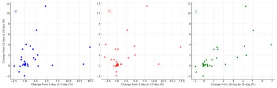 We conducted a regression analysis to quantitatively assess the relationship between yield changes at specified intervals using annual percentage changes in yield between intervals of 1 day and 5 days, 5 days and 10 days, 10 days and 15 days, and 15 days and 20 days over a 30-year period. The analysis aimed to determine the statistical significance and strength of relationships between earlier interval changes and their impacts on subsequent intervals. The regression model (R² = 0.614) revealed that approximately 61.4% of the variability in the yield changes between the 15-day and 20-day intervals could be explained by the changes in earlier intervals. Specifically, changes between the 10-day and 15-day intervals demonstrated a strong and statistically significant positive relationship with changes between the 15-day and 20-day intervals (coefficient = 0.912, p < 0.001), indicating a robust influence on yield outcomes. Visual inspection of the scatter plots (Figure 4) reinforced these findings, with changes between the 10-day and 15-day intervals showing a clear positive trend, suggesting that increases in this interval significantly impact the yield changes in the subsequent interval. In contrast, changes between the 1-day and 5-day intervals did not show a significant influence on the yield changes in the 15-day to 20-day interval, consistent with its non-significant statistical indicator in the regression analysis. The results underscore the importance of strategic CC termination timing, particularly highlighting the interval between 10 days and 15 days as critical for influencing subsequent yield outcomes. These insights suggest that management practices should focus on optimizing conditions during this interval to potentially enhance yields. Additionally, the variability in yield responses across different intervals indicates that adaptive management strategies, responsive to annual and situational conditions, may be necessary to maximize the yield benefits.