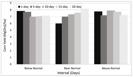The evaluation of corn yield in relation to the interval between CC termination and corn planting, stratified by seasonal rainfall conditions, presents nuanced insights. The division of the 30-year seasonal rainfall into three categories, below normal (BN), near normal (NN), and above normal (AN), helps contextualize yield responses under varying moisture regimes (Figure 5). Contrary to initial assumptions, the analysis revealed a non-linear relationship between the intervals and corn yield across different rainfall scenarios. Under BN conditions, yield did not consistently decrease with shorter intervals, challenging the expectation that reduced intervals would exacerbate moisture deficits. Notably, the 20-day interval under NN conditions demonstrated the highest yield, which diminishes progressively towards the shorter intervals, a trend aligning with the conventional wisdom that adequate moisture availability coupled with longer intervals may enhance yield. However, this pattern does not hold uniformly across all scenarios, indicating that other factors beyond soil moisture may influence yield outcomes. In AN years, the interval length had minimal impact on yields, suggesting that in periods of ample rainfall, the CC water consumption has negligible effects on the subsequent corn crop. These findings suggest a degree of flexibility in the timing of CC termination, which could prove beneficial for farmers navigating variable weather conditions. Importantly, while the intervals appear to have some effect on yield, particularly in NN conditions, the overall minimal differences across intervals and rainfall categories underscore that the strategic length interval can be balanced with other agronomic and environmental benefits provided by CCs without resulting in significant yield penalties.