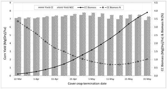 Long-term average (1991–2020) CC biomass, CC biomass N content, and corn yield for different CC termination dates. Yield CC and Yield NCC represent corn yield with and without a cover crop, respectively. For all simulations, corn was planted 10 days after CC termination.