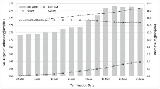 Total soil organic carbon (SOC) in soil profile at the end of 30-year simulation period (bars), 30-year average cover crop (dashed line with square marker), and corn (circle markers) and total biomass (dashed line) for 15 termination dates.