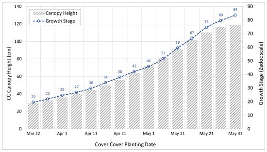 Despite the conventional consensus that terminating cereal rye before the end of the boot stage is the best practice, there are instances where high herbicide efficiency has been observed during the heading stage. For example, Ref. [42] found that cereal rye cover crops could be controlled with 98% efficiency using glyphosate (N-(phosphonomethyl) glycine), administered when the rye was approximately 99 cm tall and transitioning between the boot and heading stages. Thus, while 1 May is typically recommended to avoid reduced termination efficiency and prevent competition with the subsequent corn crop, on-field studies suggest the 6 May termination, where the CC on average reached the early heading stage, could still be viable, albeit with specific considerations.