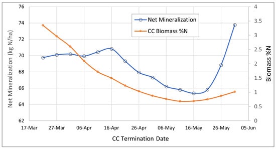 Seasonal patterns of cumulative net nitrogen mineralization, examined from cover crop termination through to corn harvest, reveal the implications of the diminishing nitrogen content (increasing C:N ratio) in CC biomass (Figure 10). Interestingly, despite a marginal uptick in biomass N percentage for late-May termination dates, net mineralization exhibited a marked increase, suggesting that abiotic factors such as soil temperature and moisture, perhaps coupled with the heightened microbial activity associated with warmer conditions, can enhance nitrogen mineralization, offsetting the effects of lower biomass nitrogen content [39].
