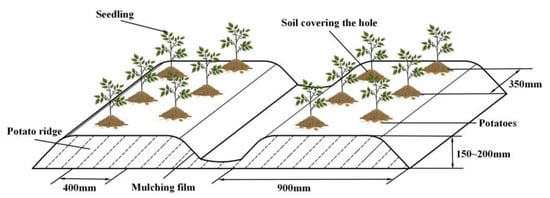 Figure 1 shows a schematic diagram of ridge double-row hole sowing and soil covering for planting potatoes in the hilly and mountainous areas of northwest China. The ridge height is 150–200 mm, with a width of 900 mm, and it is covered with a 1200 mm plastic film. Seeds are sown by punching holes in the film, with potato seedlings arranged in double rows on the ridge to allow for ventilation and light transmission. Sowing depth is 130 mm, plant spacing is 350 mm, and row spacing is 400 mm. After sowing, a 30–50 mm layer of soil covers the planting holes to prevent the film from being blown off by strong winds and to reduce soil moisture loss.