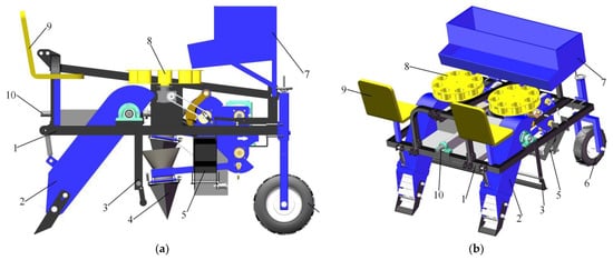 - Sun, W.; Liu, X.L.; Zhang, H.; Wang, H.C.; Tian, B. Design of a potato fertilization and planting ridge-making full-film mulching integrated machine. Trans. Chin. Soc. Agric. Eng. 2017, 33, 14–22. (In Chinese) [Google Scholar]