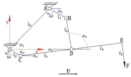 Figure 4 shows a schematic diagram of the film-piercing and hole-punching mechanism, where OC and AB are cranks, CD and BD are connecting rods, and the two ends of connecting rod BD are, respectively, hinged with crank AB and the hole-punching and sowing connecting rod CD. The hole-punching and sowing mechanism EF is installed on the hole-punching and sowing connecting rod CD. The OXY rectangular coordinate system has O as the origin, the horizontal direction as the x-axis, and the vertical direction as the y-axis. Relative to this coordinate system, the trajectory of the seeding device point F is given by the following equation [19,20,21].