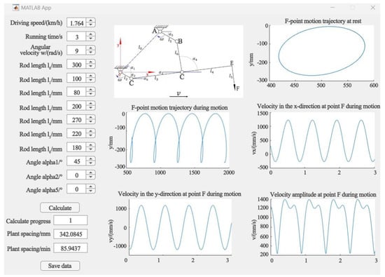 According to Formula (1), the parameters of the film-piercing and hole-punching mechanism affect the displacement and velocity of point F of the seeder. To optimize the design of this mechanism, parameter optimization is conducted using MATLAB R2022a software based on the kinematic model. The MATLAB application interface, depicted in Figure 5, includes sections for mechanism parameter settings, calculation–result display, and image representation. By inputting the necessary mechanism parameters, the planting trajectory corresponding to point F of the seeder, along with its horizontal and vertical velocities, can be determined.