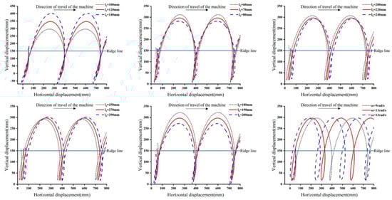 The trajectory of point F shown in Figure 6 resembles the Greek letter γ. With the increase in the length of upper crank AB(), the trajectory of point F is elongated vertically, the amplitude of the up and down movement of the planting duckbill increases, the position of the trajectory intersection point remains almost unchanged, the offset of the buried part increases, and the planting depth increases; with the increase in the length of the lower crank OC(), the trajectory of point F is “compressed”, the vertical movement amplitude decreases, the position of the trajectory intersection point approaches the ridge line, the horizontal displacement around the lower part of the trajectory, subsequently referred to as “button”, increases accordingly, and the displacement between the trajectory intersection point and the lowest point increases; with the increase in the length of the connecting rod CD(), the horizontal displacement around the button decreases, and the displacement between the trajectory intersection point and the lowest point decreases; with the increase in the length of the extending part DE of the connecting rod CD(), the trajectory as a whole shifts slightly, and the highest point rises, with very little impact on the other parameters, which can be almost ignored; with the increase in the length of the connecting rod BD(), the trajectory as a whole shifts downward; with the increase in the angular velocity (), the position of the trajectory intersection point moves upward, the horizontal displacement around the button increases accordingly, and the planting row spacing decreases.