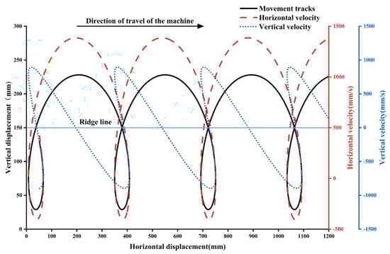As shown in Figure 7, the plant spacing basically meets the agronomic requirements. When the point F moves to the ridge line, the horizontal velocity is −0.407 m/s, which is opposite to the direction of the unit’s forward speed and close in magnitude, largely avoiding the occurrence of film tearing and lifting. When the point F moves to the highest and lowest points (inoculation point and sowing point), the vertical velocity is close to zero, thus meeting the design requirements.