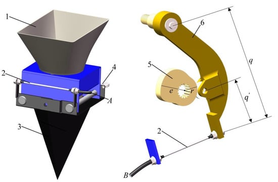 According to the requirements of the overall machine design, to meet the overall coordination of the unit, the installation positions of point O and point A are determined. The measured fixed dimensional parameters are and . The length of the seeder is set to .