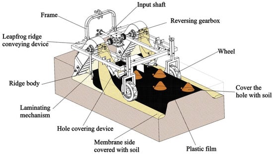 - Dai, F.; Zhang, S.L.; Song, X.F.; Zhao, W.Y.; Ma, H.J.; Zhang, F.W. Design and experiment of a combined operation machine for double-film double-ridge double-width film covering and soil covering. J. Agric. Mach. 2020, 51, 108–117. (In Chinese) [Google Scholar]