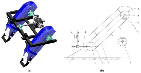 In order to achieve the task of digging furrows, forming ridges and transporting soil backwards, improvements have been made to the scraper-lifting belt-type soil-covering device developed by our team. The lifting belt of the device has been changed to a lifting chain, solving the problems of the high precision requirements for processing and the assembly and the “deviation” of the conveyor belt [29]. As shown in Figure 10, the straddling ridge-forming and soil-conveying device consists of a soil-lifting shovel, a scraper board, a lifting chain, driven wheel, a depth adjuster of the soil lifting shovel, a tension device for the lifting chain, a driving wheel, etc.