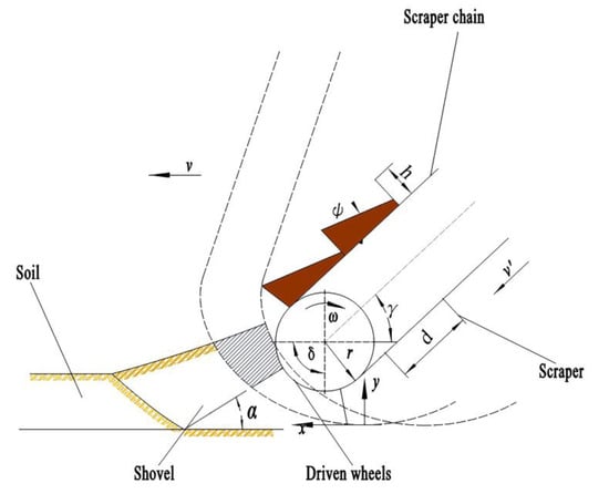 The upper surface of the soil on the scraper board is at an angle with the horizontal plane, which is the internal friction angle of the soil . The amount of soil on each scraper is the amount of soil transported by the length of the scraper chain d (spacing between adjacent scrapers). The volume of soil transported is obtained by multiplying the end surface area by the width of the scraper board. If the forward speed of the unit is v and the linear speed of the scraper chain is v′, then the amount of soil Q transported by the unit forward d′ is [29]: