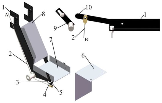 Figure 12 shows the structural diagram of the hole-covering device. The hole-covering device is composed of a soil-sliding trough, a soil-turning shell, a soil-turning pull rod, a hinge shaft, a limiting shaft, a pulley, a lifting pull line, a traction rod, and a control rod. The lifting pull lines A and B are integrated, and the working principle of the control rod is consistent with the cam principle.