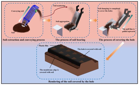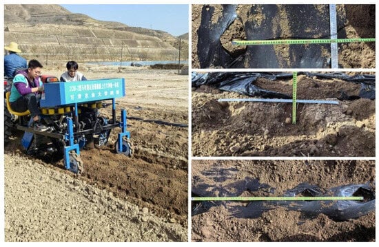 Potatoes, as a versatile crop, have great potential for increasing planting areas and yields [1,2]. In 2015, China initiated a strategy to make potatoes a staple food, providing guidance for the development of the potato industry. The unique geographical environment and climate conditions in the northwest region are highly suitable for potato growth, playing an important role in promoting farmers’ incomes and regional economic development [3,4,5]. In this region, potato planting often employs full film-covering technology for drought resistance. This method features moisture retention, water conservation, fertilization retention, and yield improvement, making it one of the main technologies for increasing potato yield and income in the cold and arid areas of the northwest [6,7]. The planting methods mainly include planting before film covering and planting after film covering [8]. The former method requires manually tearing the film to release the seedlings after emergence, or covering the seed row with soil according to agronomic techniques to allow for natural emergence. This can lead to issues such as time-consuming and labor-intensive manual seedling release, seedling burning, or soil compaction in the planting rows, resulting in a poor seedling emergence rate if not carried out in a timely manner. The latter planting model, which involves covering the film after planting, is more suitable for the agronomic requirements of potato cultivation under film in the northwest region. However, this method lacks mature equipment for hole-punching and seeding on the film, necessitating manual hole-punching and covering. This can result in an inadequate covering of the holes, exacerbating soil moisture loss and causing the film to be blown off by strong spring winds [9].