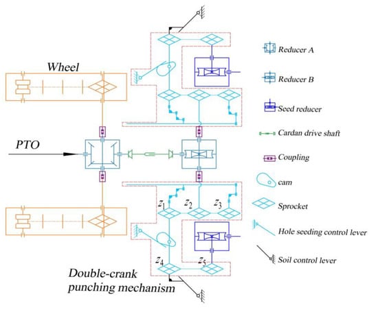 The transmission system of a potato planter with whole plastic–film mulching and covering soil on seeding band is shown in Figure 14. The tractor power output shaft transmits power to reducer A through the universal joint drive shaft. After the output shafts on both sides of reducer A reduce the speed by 1.5 times, the power is transmitted to the straddling ridge-forming and soil-conveying device. The speed of the rear output shaft remains the same, and the power is transmitted to reducer B through the universal joint drive shaft. After being further reduced by 10 times by the reducer B, the power is then transmitted to the film-piercing and hole-punching mechanism, the seeding system, the opening and closing system of hole-forming machine, and the soil-covering device control system.