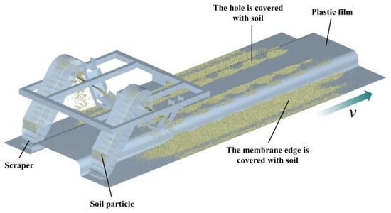During simulation, the soil–soil device, soil–mulch device, and soil–hole-covering device interactions all use the Hertz–Mindlin (no-slip) contact model [32], with simulation parameters as shown in Table 1. The movement of a single scraper includes linear motion along the direction of the scraper, rotational motion around the driving wheel, rotational motion around the driven wheel, the frame is set to be fixed, the mulch is set to move linearly in the opposite direction of the actual machine movement, the soil-turning shell is set to rotate periodically around the hinge axis, and a time difference is set to stagger the motion of the soil-turning shells on both sides.