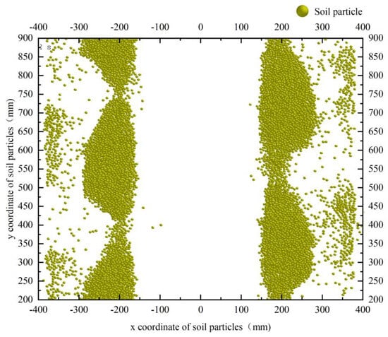 By using the EDEM post-processing options for analysis and processing, as shown in Figure 17, it is easy to see that the plant spacing is 350 mm and the row spacing is 400 mm, indicating that the structural and operating parameters of the device are reasonable. There are more soil particles scattered around the edges of the film, and the covering soil is not concentrated enough. There is still room for improvement in structural optimization, but it has a relatively small impact on the overall soil-covering effect of the machine and can meet the needs of soil-covering operations.