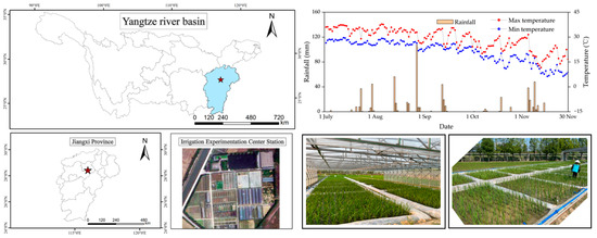 A rice field trial was conducted from 28 July to 4 November 2023 at the Jiangxi Provincial Irrigation Experimentation Center Station (116°00′ E, 28°26′ N) in the Ganfu Plain Irrigation Zone, Jiangxi Province (Figure 1), which is a typical subtropical humid monsoon climate zone. Over the past 46 years (1978–2023), the mean annual temperature, rainfall, sunshine hours, and pan evaporation in the study area were 17.6 °C, 1508.5 mm, 1700 h, and 917.5 mm, respectively. Observations from the Jiangxi Provincial Irrigation Experimentation Center Station Research Base weather station provided data on daily maximum and lowest temperatures, as well as rainfall, during the experimental period (Figure 1). Rainfall is unevenly distributed throughout the year, with rainfall mainly concentrated in March–July, accounting for 66% of the annual average; September–December rainfall accounts for only 15% of the year. The experimental soil was a red loamy rice soil with an average soil organic matter content of 20.0 g kg−1 in the 0–50 tillage layer, total nitrogen of 1.6 mg kg−1, total phosphorus of 0.5 mg kg−1, total potassium of 6.4 mg kg−1, effective phosphorus of 24.5 mg kg−1, available potassium of 81.3 mg kg−1, pH value of 5.6, soil capacity of 1.5 g cm−3, and field water holding capacity of 29.7% (gravimetric).