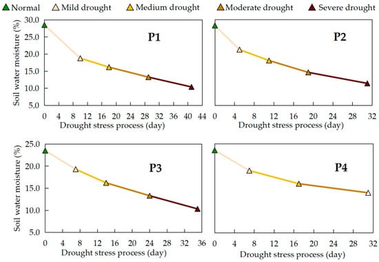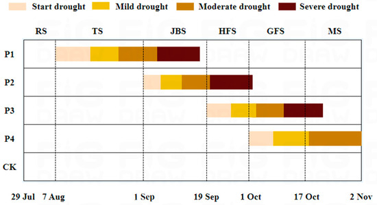 The continuous drought stress process for each treatment was at different growth stages (Figure 2). The continuous drought stress process of P1 treatment was from 7 August to 17 September (cumulative 41 days), and it has taken 10, 8, 11, and 12 days to reach the mild, medium, moderate, and severe drought stress levels, respectively. The continuous drought stress process of P2 treatment was from 1 September to 2 October (cumulative 31 days), and it has taken 5, 6, 8, and 12 days to reach the mild, medium, moderate, and severe drought stress levels, respectively. The continuous drought stress process of P3 treatment was from 19 September to 24 October (cumulative 35 days), and it has taken 7, 7, 10, and 11 days to reach the mild, medium, moderate, and severe drought stress levels, respectively. The P4 treatment started with continuous drought stress from the filling stage and did not reach the moderate and severe drought stress levels due to the low temperatures and rainfall in the locality. Its drought stress process was from 1 October to 2 November, and it has taken 7 and 11 days to reach the mild and medium drought stress levels, respectively.
