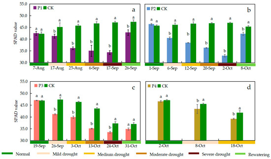 Relative chlorophyll content (SPAD value) under different treatments. (a–d) are the P1, P2, P3, and P4 treatments compared to the CK treatment, respectively. The data represent the means ± standard deviation of three separate samples. Different letters above vertical bars indicate significant differences between means at a p < 0.05 level.