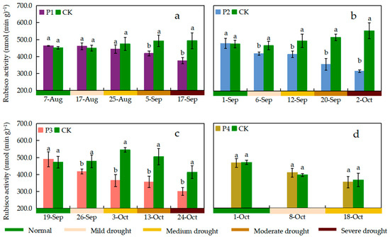 Leaf Rubisco activity was observed once before the start of drought stress and once during the period when different drought stress levels were reached for the P1, P2, and P3 treatments, respectively (Figure 7). The drought stress process for the P4 treatment occurred at a late growth stage of the rice, when only mild and moderate drought stress levels were reached, and thus only three observations were available. The leaf Rubisco activity of CK treatment showed a trend of increasing and then decreasing, with the Rubisco activity reaching its maximum value at the heading–flowering stage and decreasing to the minimum value at the maturity stage (Figure 7). The P1 and P4 treatments were not significantly different from the CK treatment when they were under mild and medium drought stress. The leaf Rubisco activity of the P2, and P3 treatments was significantly lower than that of the CK treatment throughout the drought stress period. The Rubisco activity of rice leaves continued to decrease with increasing drought stress levels. The variations in leaf Rubisco activity under the P2, and P3 treatments were more significant than those under the CK treatment. Compared with the CK treatment, the P2 treatment showed a 42.91% decrease in leaf Rubisco activity when the drought stress level reached severe drought, which was the largest decrease among the treatments. Rubisco activity decreased by 23.82%, 42.91%, and 27.46% in P1, P2, and P3 treatments compared to CK at mild drought and severe drought, respectively. Notably, leaf Rubisco activity was higher in the P1 and P4 treatments than in the CK treatment when the drought stress level reached mild drought stress, but it was not statistically significant.