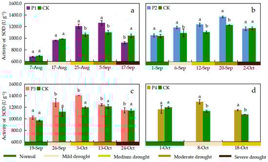 Leaf SOD activity under different treatments. (a–d) are the P1, P2, P3, and P4 treatments compared to the CK treatment, respectively. The data represent the means ± standard deviation of three separate samples. Different letters above vertical bars indicate significant differences between means at a p < 0.05 level.