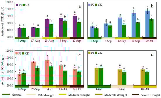 Leaf POD activity under different treatments. (a–d) are the P1, P2, P3, and P4 treatments compared to the CK treatment, respectively. The data represent the means ± standard deviation of three separate samples. Different letters above vertical bars indicate significant differences between means at a p < 0.05 level.