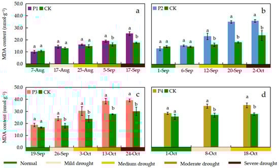 Leaf MDA content under different treatments. (a–d) are the P1, P2, P3, and P4 treatments compared to the CK treatment, respectively. The data represent the means ± standard deviation of three separate samples. Different letters above vertical bars indicate significant differences between means at a p < 0.05 level.