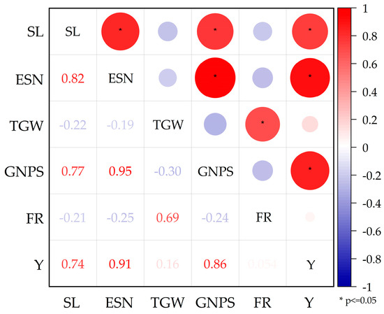 Correlation analysis of rice yield and component factors. SL: spike length; ESN: effective spike number; TGW: thousand grain weight; GNPS: grain number per spike; FR: fruiting rate; Y: yield.