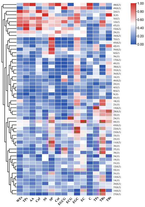 Hierarchical clustering heat map of tested chemicals in SSDT. The rows represent different KZ and JJ samples. Differences in chemical levels are shown by the color gradient of the blocks, and the scale bar shows the variation range of chemical normalized levels.