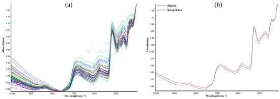 NIR spectral profile of dried SSDT: (a) original spectra of dried SSDT; (b) mean spectra of KZ and JJ.