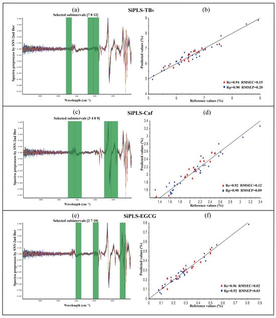 Previous research indicates that the SiPLS modeling method, which splits the NIR spectrum into multiple subintervals and calculates all possible PLS models using combinations of these subintervals, can significantly improve model performance [36]. Here, it was used to establish some SSDT chemical prediction models. The preprocessed spectra were uniformly divided into 10, 15, 20, or 30 subintervals, then certain spectral subintervals were selected, and a combination of three or four optimal spectral subintervals was employed to establish predictive models. It is worth noting that the SiPLS models selected the combinations of optimal subintervals (7, 8, 12) for the TBs prediction, (3, 4, 8, 9) for the Caf prediction, and (2, 7, 10) for the EGCG prediction, which were highly effective (Table S3). Among them, the SiPLS-TBs model (RMSEC = 0.15, Rc = 0.94, RMSEP = 0.20, Rp = 0.90) was observed by dividing the full spectrum into 20 subintervals with the selected wavenumber ranges of 5796.97–6097.81, 6101.66–6398.65, and 7305.03–7602.02 cm−1 (Figure 3a,b). These subintervals probably reflect the information linked to the telescopic vibration of multiple phenolic hydroxyl groups [4]. Additionally, the optimal SiPLS-Caf model (RMSEC = 0.12, Rc = 0.92, RMSEP = 0.09, Rp = 0.90) was established by dividing the full spectrum into 15 subintervals with the selected wavenumbers of 4801.88–5199.14, 5203.00–5600.26, 6807.48–7204.75, and 7208.60–7605.87 cm−1 (Figure 3c,d). These spectral bands are mainly associated with the stretching vibrations of N-H and C-H groups and may reflect the information of caffeine [37]. Simultaneously, the SiPLS-EGCG model (RMSEC = 0.02, Rc = 0.96, RMSEP = 0.03, Rp = 0.92) achieved excellent results when the full spectrum was divided into 20 subintervals and the wavenumbers in the ranges of 4296.624–4597.464, 5796.97–6097.81, and 6703.35–7004.191 cm−1 were selected (Figure 3e,f). Indeed, EGCG is a major active constituent of tea polyphenols, and it has characteristic spectral subintervals related to the O-H and C-H groups in the phenolics [38].