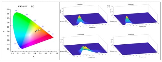 Fluorescence EEM and chromatic characteristics of SSDT brew: (a) CIE 1931 color space chromaticity diagram in the (x, y) coordinate system for SSDT; (b) fluorescence characteristics of SSDT brew based on PARAFAC, with 4 components. The x-axis in each component diagram represents the emission wavelength, the y-axis represents the excitation wavelength, and the z-axis represents the fluorescence intensity; the yellow color indicates the high fluorescence intensity, and the blue color indicates the low fluorescence intensity; the excitation wavelength at which the main fluorescence peak with the highest relative fluorescence intensity is located is the optimal excitation wavelength.
